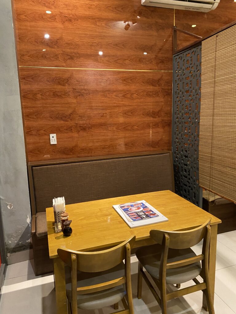 外観は派手さはなく、落ち着いた日本らしい佇まい。暖色系の照明に控えめな看板が印象的で、扉を開ける前から「ここなら安心できそう」と思わせてくれます。ダナンの街並みの中にありながら、どこか日本の居酒屋街を思い出させる雰囲気です。