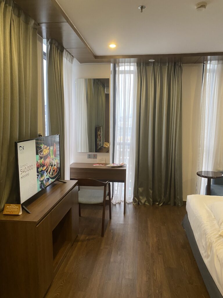 客室はシンプルで落ち着いたデザイン。大きめの窓からはダナンらしい開放的な景色が楽しめ、海側の部屋を選べばビーチが一望できます。バスルームやアメニティも使いやすく、清潔感がしっかり維持されています。ワークデスクやWi-Fi環境も整っているので、長めの滞在にも向いています。