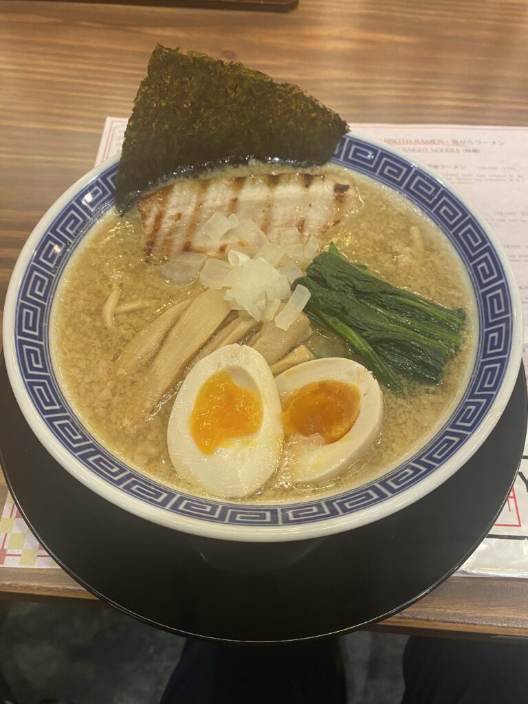 麺はスープによく絡む中細麺で、ほどよいコシがあり食べ応えも十分。チャーシューは柔らかく、噛むと旨味がじゅわっと広がります。味玉は半熟で、とろりとした黄身がスープと相性抜群。全体として完成度が高く、日本で食べるラーメンに近い満足感が得られる一杯でした。