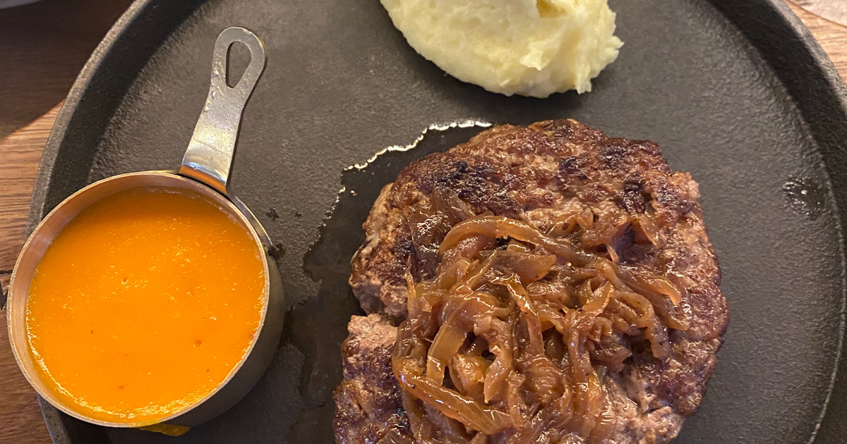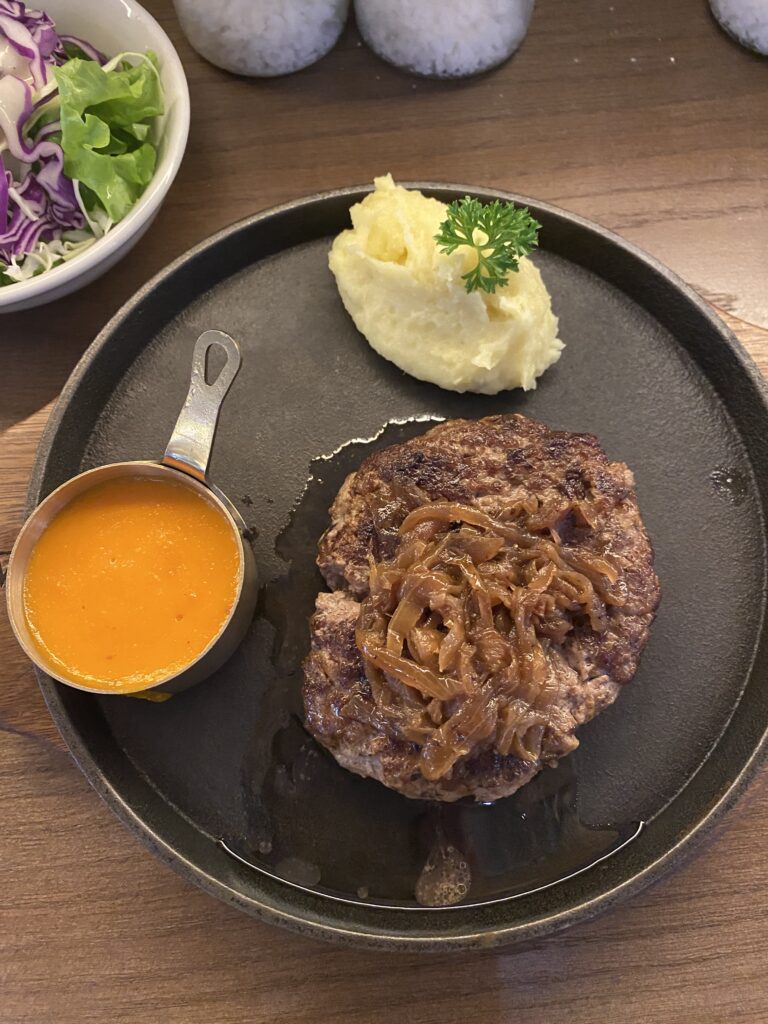 今回注文したのは看板メニューのWagyu Hambagu。ナイフを入れた瞬間に肉汁がじんわりと溢れ、和牛ならではの旨味がしっかり感じられます。外は香ばしく焼き上げられ、中はふっくらジューシー。肉の甘みとソースの相性も良く、重すぎず最後まで美味しく食べられました。付け合わせの野菜も丁寧に調理されており、全体のバランスが非常に良い一皿です。