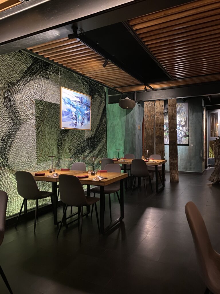 店内はモダンで落ち着いたデザイン。テーブル間隔も広めに取られており、静かに会話を楽しめる大人の空間です。ワインセラーもあり、料理に合わせてグラスワインを楽しめるのも魅力。